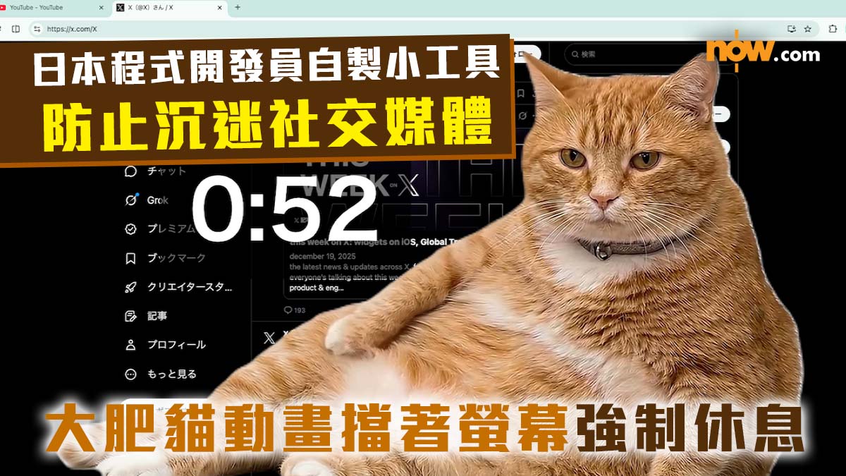 日本網民 @konekone2026 是一個程式開發員,日前就在社交媒體上發文,指自己開發了一款Chrome Extension的小工具「Cat Gatekeeper」,用家使用X、Instagram、TikTok或Youtube社交媒體的時候,每過一小時一隻大肥橘貓就會從螢幕中走出,輕輕躺在螢幕中,擋著視窗的內容,旁邊則有5分鐘倒計時,強制用家休息5分鐘。