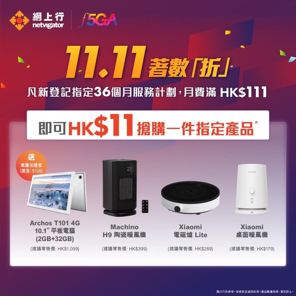 即日起,新登記36個月指定服務計劃客戶,月費滿$111即可用$11搶購Archos T101 4G平板電腦(價值$1,099)、Machino H9陶瓷暖風機(價值$399)或小米電磁爐(價值$289)及小米桌面暖風機(價值$179),數量有限,售完即止。