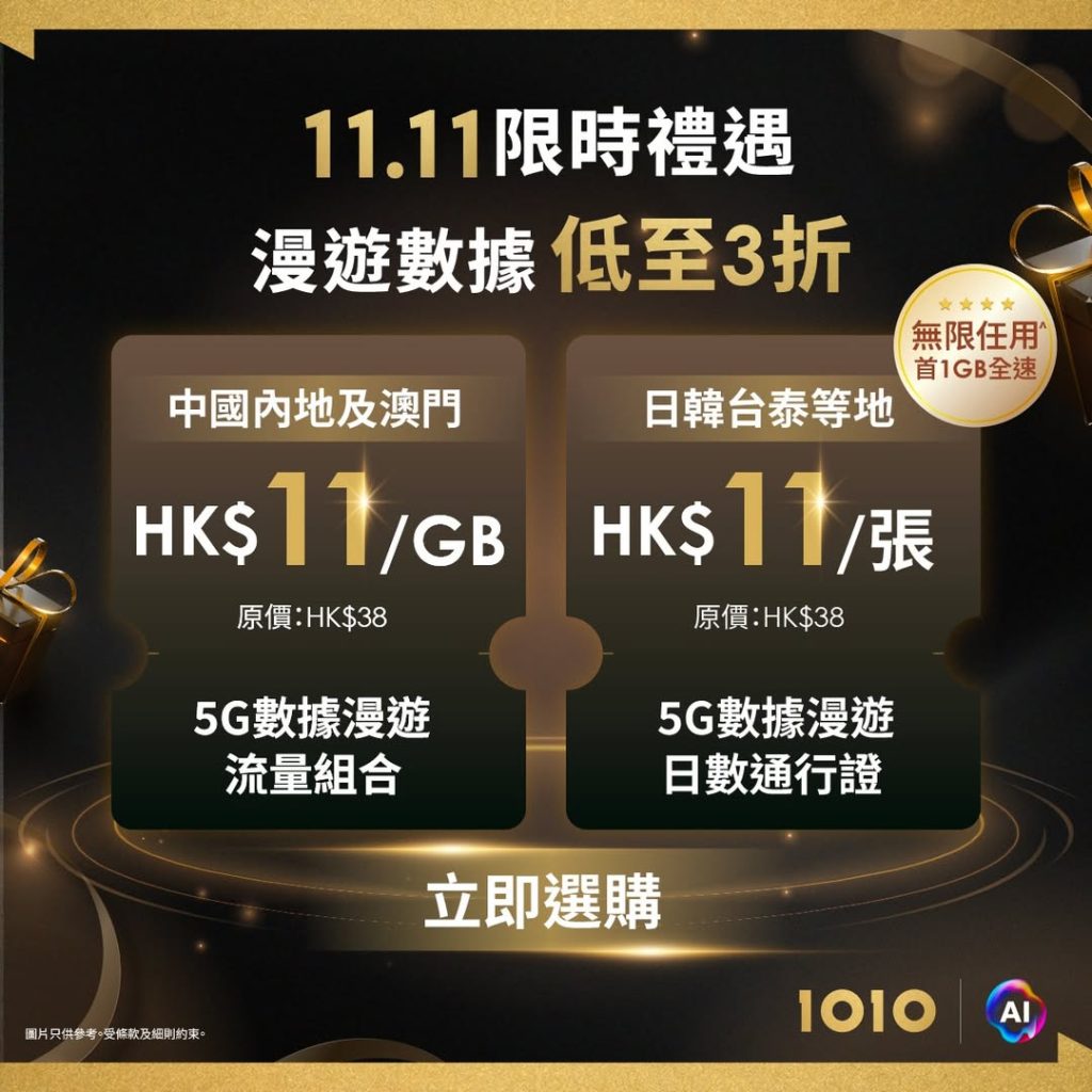 雙11優惠丨2. 1010漫遊數據低至 $11