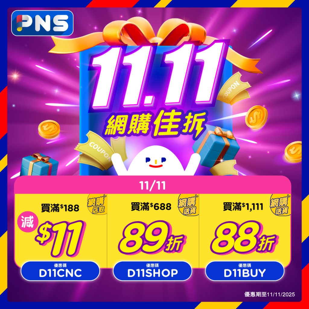 屈臣氏網店推出「雙11狂賞Code」,由即日起至11月13日,累積消費最高的會員參加抽獎,即有機會贏取iPhone 17 256GB及AirPods 4耳機等獎品。首次購物新客戶即減$50。另設門市特別優惠,即日起至13日期間購物滿$199,只需加$1即可換購維他檸檬茶6包裝,另外送$50屈臣氏優惠券。