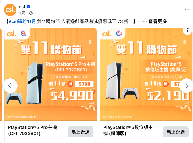 csl網店推出多款遊戲主機及配件激減優惠!其中數位版PS5主機低至73折(折實價$2,190)。另外,Switch 2 Mario Kart World 主機組合及Switch 2 Pro控制器分別享97折(折實價$3,650)及88折(折實價$475)優惠。