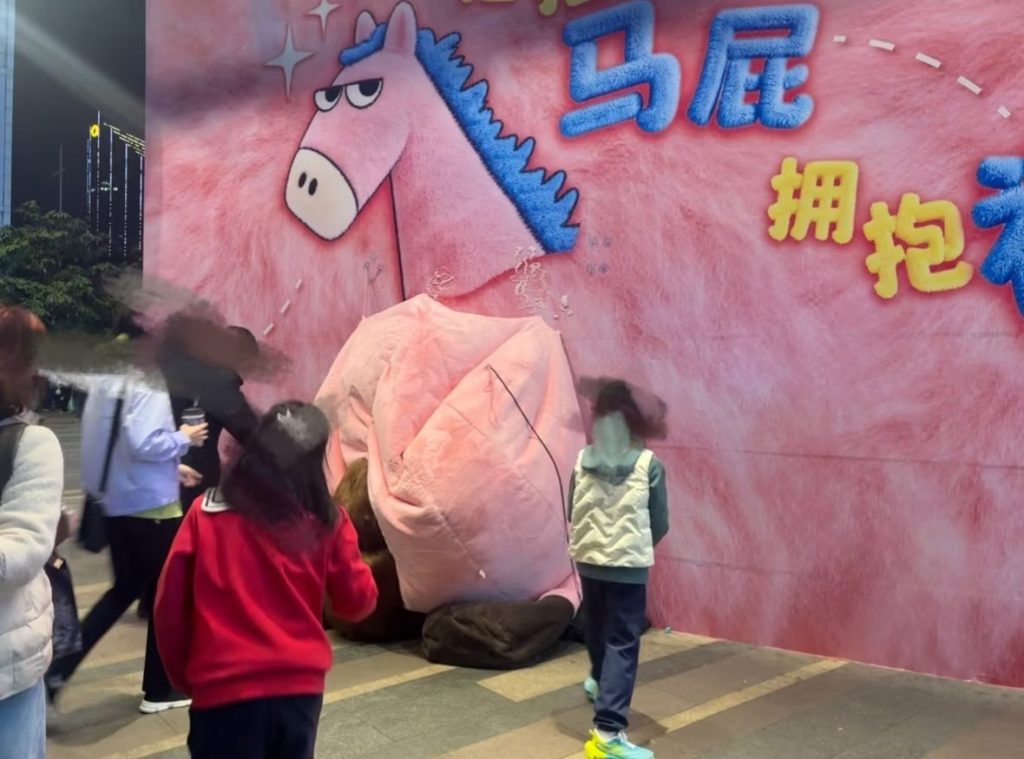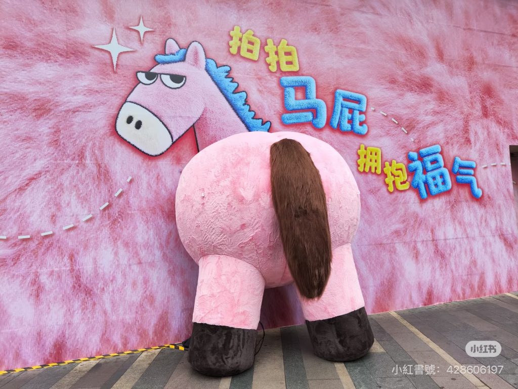 為迎接丙午馬年,內地不少商場可謂落足心思。廣州、深圳、南京、北京等地,紛紛推出以「拍馬屁」為主題的互動裝飾,將帶貶義的「拍馬屁」一詞,配以「拍拍馬屁萬事順利」等吉祥句轉化為祝福。「拍馬屁」裝置形式多樣,包括毛絨絨的巨型充氣馬臀、可愛的卡通馬造型雕塑,甚至有景區提供真實馬匹讓遊客輕拍其臀部,賦予其「馬上好運」、「馬到功成」等寓意。部分裝置拍打後更有機會抽獎,增加互動趣味。搞笑的「馬PatPat」成功吸引網民注意,即成為新年打卡新寵。