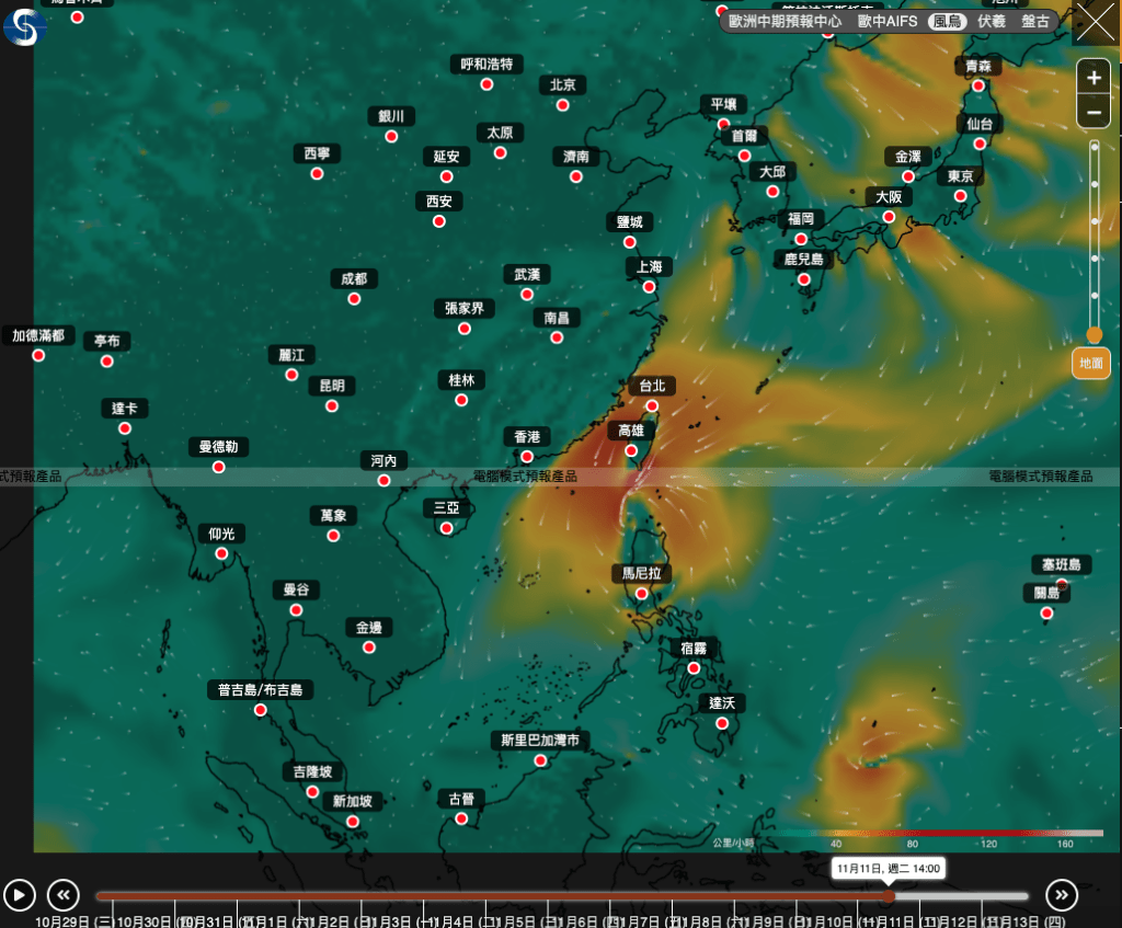 盤古AI則顯示11月3日至5日及11月9日至11日將分別有兩個熱帶氣旋先後影響南海區域。