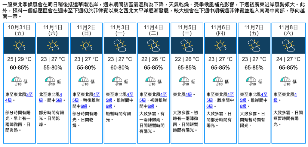 根據天文台今日(30日)下午3時的最新九天天氣預報,該低壓區較大機會在下周中期進入南海中南部,並移向越南一帶。本周五(31日)萬聖節市區氣溫25至29度,日間部份時間有陽光;下周五(7日)則是廿四節氣中的立冬,當日市區氣溫23至27度,似乎未有冬意。