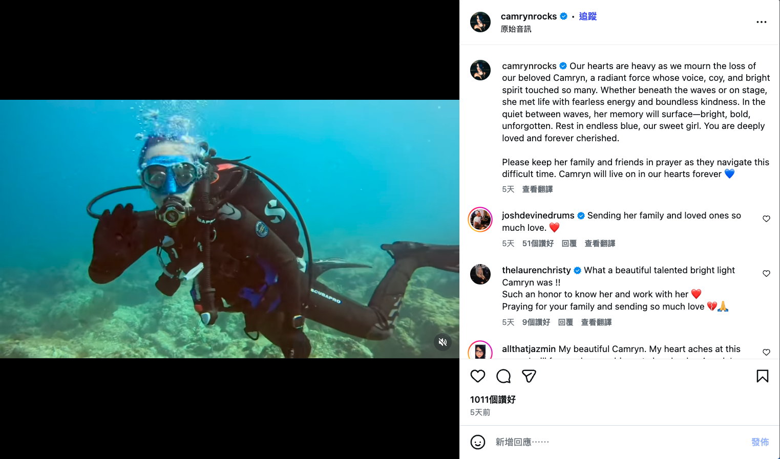 她的家屬發文指:「我們的心情沉重,她是一股光輝的力量,她的歌聲、靈巧且明亮的性格感動了很多人,無論是在海浪之下還是在舞台上,她都以無畏的能量和善意迎接人生;她與生俱來的光芒,永遠都不會被遺忘。」