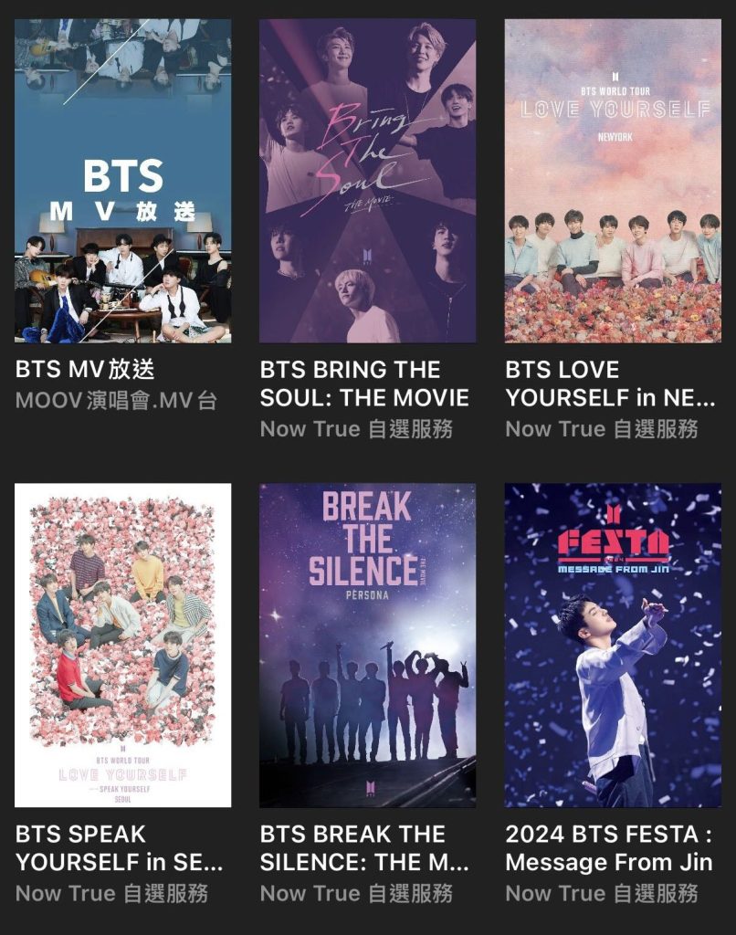 在等待演唱會來臨前,A.R.M.Y們可透過Now True自選服務,重溫BTS多個演唱會回味,包括《BTS BRING THE SOUL: THE MOVIE》、《2024 BTS FESTA : Message From Jin》及《BTS SPEAK YOURSELF in SEOUL FINAL》等演唱會及紀錄片,再次感受BTS的舞台魅力!