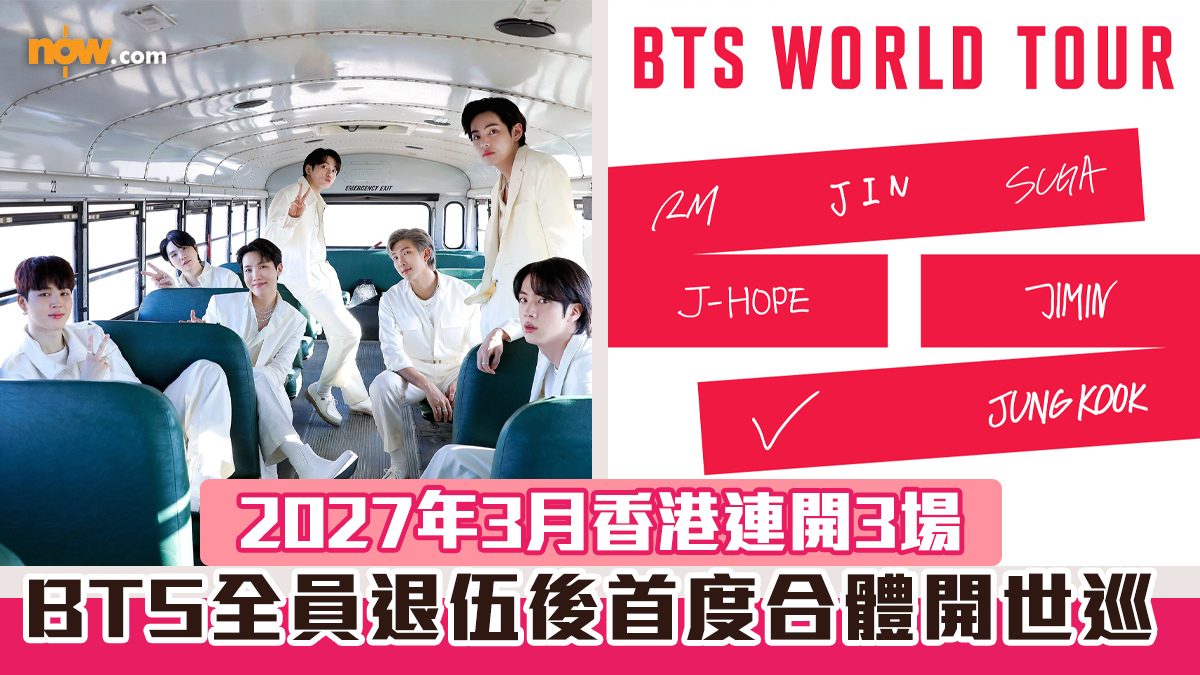 【Now.com】風靡全球的K-POP天團防彈少年團(BTS)於去年全員退伍,近日官方正式公布BTS全新世界巡迴演唱會首階段日程,將於2026年4月開展,香港站更確定於2027年3月舉行!是團體繼2019年後,時隔8年再度在香港舉辦演唱會,令一眾「A.R.M.Y」(BTS粉絲暱稱)熱切期待!