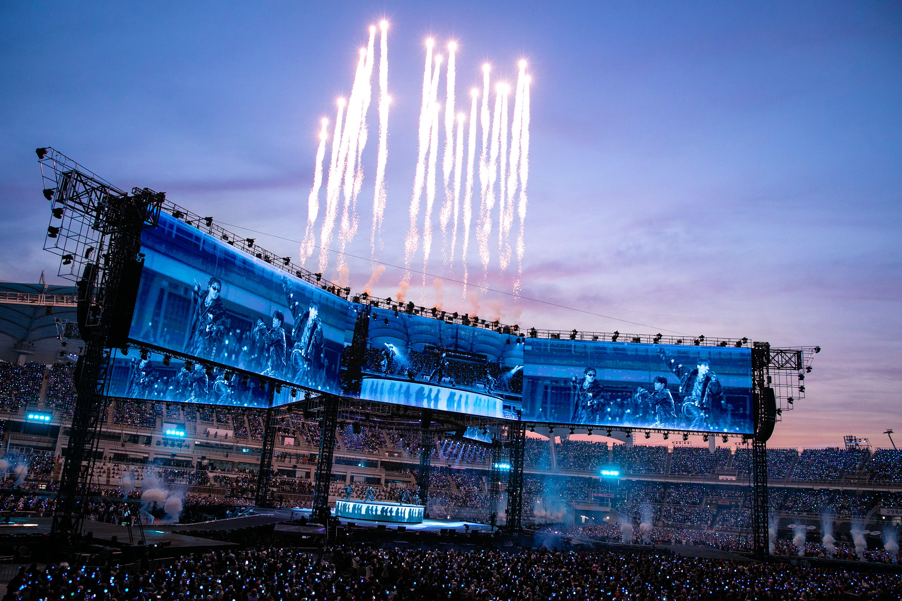 BTS世界巡迴演唱會於4月9日、11日及12日舉行,首日氣溫僅11度且下著傾盆大雨,但仍無阻粉絲熱情,7子亦無懼濕身,在 360 度全景旋轉舞台上揮汗如雨。除了演唱新專輯《ARIRANG》的新作《Hooligan》、《Swim》外,亦帶來《Fake Love》、《Dynamite》及《Run BTS》等重新編曲的經典舞台。唱至《IDOL》時,7子更走下舞台繞場一周與ARMY互動。早前隊長RM因在彩排時不慎傷及腳踝,至今仍未痊癒,則坐車繞場與粉絲揮手。