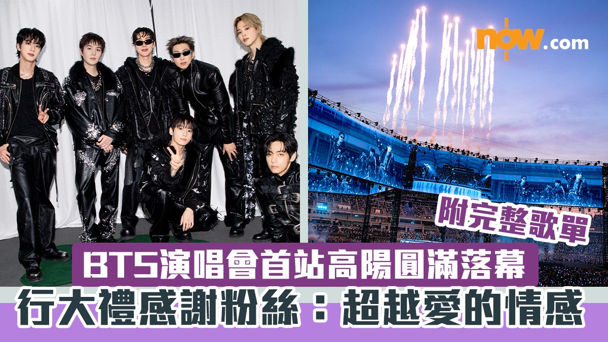 【Now.com】風靡全球的K-POP天團防彈少年團(BTS),睽違近四年的全員合體世巡《BTS WORLD TOUR 「ARIRANG」》,首站南韓高陽站共 3 場演出昨晚(12日)圓滿落幕!3場演出共吸引13.2萬名ARMY(BTS粉絲暱稱)入場,即使首日(9日)遇上傾盆大雨,4萬名粉絲仍穿上雨衣逼爆場館;演唱會尾場(12日)更獲多位藝人撐場,場面星光熠熠。