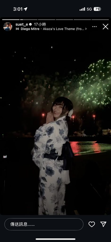 Nana表示,她發現這名穿著浴衣的女子,就是香港大胃王網紅Suet E,更翻出Suet E的社交媒體限時動態,得知Suet E當時亦在日本旅行慶祝生日,更有發在熱海穿著同款浴衣參與花火大會的影片,確認在花火大會看見的就是Suet E。