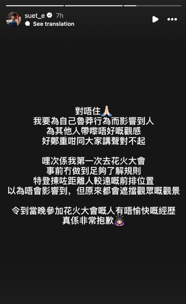 事後Suet E在Instagram上發表了一則限時動態,指自己魯莽的行為影響到別人,而且為其他人帶來不好的觀感,就此她感到抱歉。