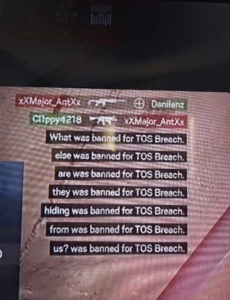 除了無故獲得大量遊戲點數和道具,有些玩家無故被封帳戶,玩家的螢幕上不停彈出其他玩家因為“Toxic Behavior”或“TOS Breach”而被禁。但值得留意的事,如果將被封的玩家名稱上而下讀的話,就可以得到一段信息。
