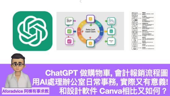 ChatGPT 做購物車, 會計報銷流程圖用AI處理辦公室日常事務, 實際又有意義! 和設計軟件 Canva相比又如何?