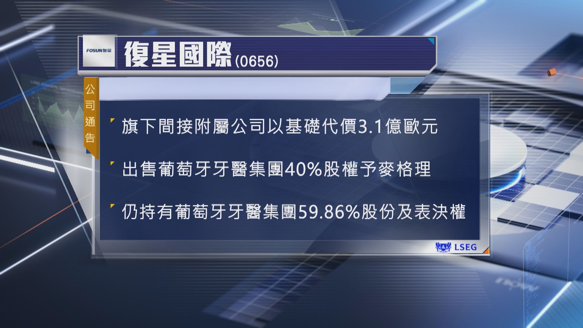 【Now新聞台】復星國際出售部分葡萄牙牙醫集團Luz Saude股權予麥格理。